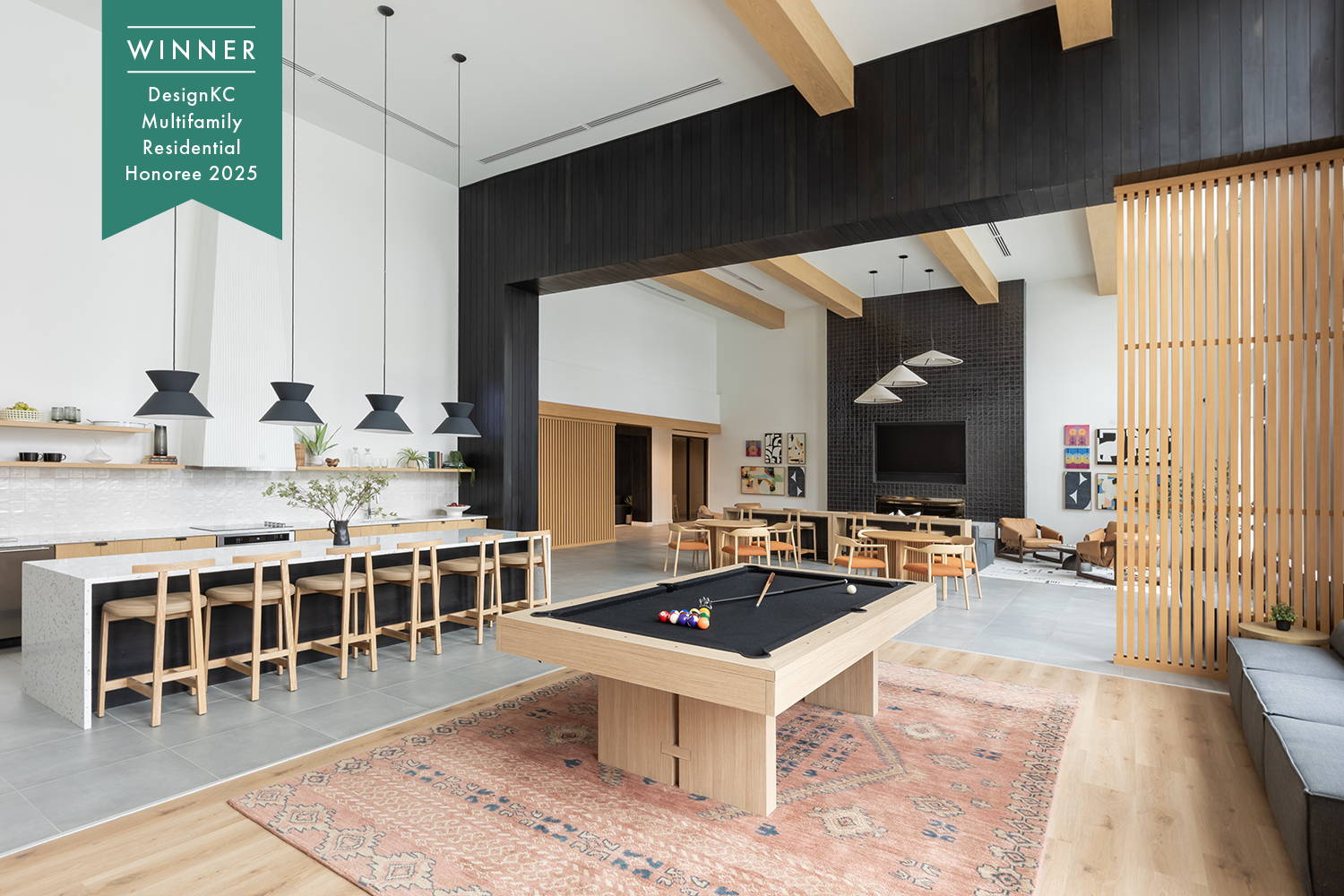The Oslo is a multifamily community envisioned and designed by TCA Architects and Prose Design Group for Ryan Companies, with interiors shaped around a calm, modern sensibility inspired by Scandinavian minimalism. A restrained color palette of warm neutrals and natural wood tones establishes a serene foundation, while darker accents and subtle pattern moments add contrast and rhythm throughout the spaces. Layered textures ranging from soft upholstery to clean architectural surfaces create depth without excess, allowing the design to feel refined yet comfortable. Artwork plays an important role in the narrative, with pieces sourced from Kansas City talent, including Emily of The Object Enthusiast and Hunter Silvey, adding personality and a local connection throughout the property while reinforcing a cohesive identity rooted in simplicity and livability.